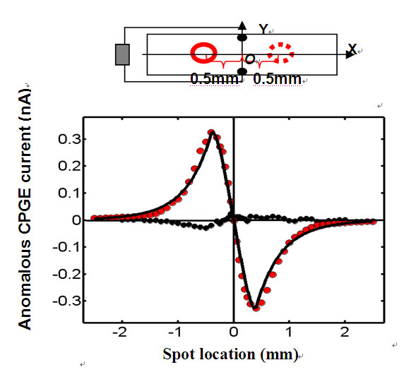 图1:常温下反常圆偏振自旋光电流随光斑位置的变化。插图为实验装置示意图,其中长条表示样品,红色圆环表示光斑,黑色原点为电极。