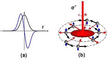 图2:(a) 表示光斑中光强和自旋化学势梯度分布。(b)表示自旋极化电子受自旋横向力产生横向位移从而形成涡旋电荷流。蓝红黑色箭头分别表示电子自旋方向,自旋流方向,自旋横向力的方向。