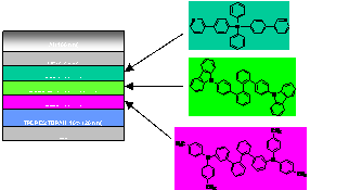 时至今日有机电致发光材料已取得了巨大的进展,但是通常采用的荧光材料(单线态发光)的内量子效率理论上只有25%,由于不同折射率物质对光传播的影响,最后只有20%的光能够发射出来,也就是只有5%的外量子效率。如果采用磷光材料(三线态发光),原来不发光的三线态也能发光,故理论上可以得到100%的内量子效率发光。OLED的量子效率是由发光材料的发光效率和电荷传输效率决定的,实验上证实蓝色磷光的光致发光效率已经可以达到100%,但是因为蓝色属于宽带发光,其导电能力将大大降低,故对于蓝色电致磷光很难实现高效发光。蓝色不但是三原色之一,而且还可以通过色变换方式得到长波长的绿色、红色发光,故开发高效蓝光对于磷光器件的产业化非常重要。由于有机材料本身的传导电子的能力不及传导孔穴的能力,故电荷传输效率低下。如何改善有机材料的电子传输性能以及开发高效电子传输材料一直是实验室努力的方向,部分结果已经发表于Chemistry Letters 2007,36, 802;Appl. Phys. Lett., 2008, 93:133301。