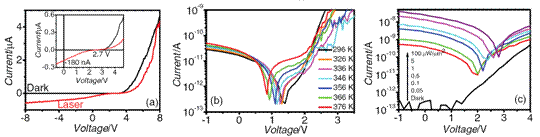 图1. (a) 光伏效应电流电压关系(b)紫外灯照射不同温度条件下,电流电压关系; (c) 不同入射光功率条件下,电流电压关系