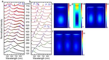 Figure 2. Resonances and mode patterns of plasmonic nanocavities with 70 nm widths, 500 nm heights, and increasing lengths. (a) CL spectra of 16 nanocavities with cavity lengths increasing from 120 (bottom) to 770 nm (top). (b) Calculated spectra using the FDTD method. Spectra are offset vertically for clarity. The black arrow at 655 nm indicates that the spectra were collected twice at the same position due to the limited measuring range of the spectrophotometer. (c), (d) Calculated mode field intensity patterns and electric field amplitude of a 260 nm-long cavity at 635 nm in the y = -35 nm and x = 0 planes, respectively. (e), (f) Calculated mode patterns in the y = -35 nm plane of 420 and 610 nm-long cavities at 539 and 523 nm, respectively.
