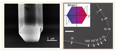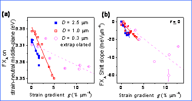 图3. 弯曲半导体纳米线/微米线中应力分布(上)、应变梯度的定义(下左),以及利用高空间、高能量阴极荧光(Cathodoluminescence Spectroscopy)光谱沿直径方向研究应变梯度效应的示意图(下右)。