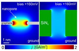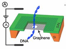 纳米孔DNA测序技术被认为是实现第三代快速,低成本,长链直读DNA分子测序最有竞争力的技术之一,对研究人类遗传病因,个性化医疗等诸多领域具有非常重大的意义。当溶液中的长链DNA分子在电场驱动下穿过一个尺度在纳米量级的小孔时,离子电流会由于DNA分子的阻塞作用形成瞬时下降,而对于电流下降的分析可以得知穿孔分子的尺寸,大小,构型等生物学特征。目前固态纳米孔测序领域面临的最大挑战是纳米孔器件承载膜太厚(空间分辨率)和DNA分子穿孔太快(时间分辨率)两大国际难题。