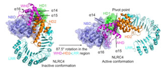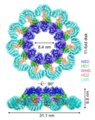 先天免疫(innate immunity)是人类免疫系统的重要组成部分,炎症复合体在触发先天免疫响应的过程中起到了关键信号转导的效应器作用,从而启动细胞凋亡等免疫应答和炎症反应。炎症复合体是胞浆内一组复杂的多蛋白复合体,是胱天蛋白酶(caspase-1)活化所必需的反应平台,其复合物单体由多个结构域构成,并在上游蛋白的激活下诱导组装形成环状复合物。炎症复合体的结构对于认识先天免疫的信号转导过程、免疫调控和病原诱导活化等免疫响应机理具有关键的核心价值,因而成为国内外一流结构生物学和免疫学实验室追棒的研究对象。