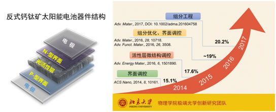 针对反式结构钙钛矿太阳能电池器件效率较低的问题,北京大学 “极端光学创新研究团队”的朱瑞研究员和龚旗煌院士等从钙钛矿薄膜形貌控制、界面调控及组分优化等角度进行了全面系统地研究,在过去的两年中取得了一系列创新成果。他们利用醋酸铅前驱体体系,先是将微量溴甲胺作为添加剂应用于钙钛矿前驱体溶液中,该策略可以有效改善钙钛矿薄膜的表面形貌,使其光学和电学性能均得到明显提升,最终,基于醋酸铅前驱体的反式平面结钙钛矿太阳能电池的光电转换效率从14.26%大幅度提高至18.32%,结果发表在《Advanced Functional Materials》上,并被选为封底内页,发表后连续两个月的访问次数在该刊排名前五,也是该刊2016年度访问次数最多的文章之一(Adv. Funct. Mater., 2016, 26, 3508,博士生赵丽宸和罗德映为共同第一作者);随后,又借助界面调控,首次在钙钛矿太阳能电池领域提出了“电荷载流子平衡”的概念,并系统地研究和实现反式钙钛矿太阳能电池器件内的电荷载流子平衡,将反式钙钛矿太阳能电池光电转换效率进一步提升至接近19%,该结果发表在《Advanced Materials》上(Adv. Mater., 2016, 28, 10718,博士生陈科、胡芹和刘堂昊为共同第一作者)。之后,又进一步采用双源前驱体溶液法,在体系中引入“甲脒”有机阳离子将吸收光谱拓展至近红外区域,并结合对空穴传输层的优化,确保了电荷有效传输和收集,同时提升了器件的开路电压,最终将光电转换效率提升至20%以上,该结果发表在《Advanced Materials》上,是目前报道的基于醋酸铅前驱体体系钙钛矿太阳能电池的最高性能(Adv. Mater., 2017, DOI: 10.1002/adma.201604758,博士生罗德映和赵丽宸为共同第一作者)。此外,他们还撰写了关于反式结构钙钛矿太阳能电池的综述文章,发表在《Advanced Energy Materials》上,对反式钙钛矿太阳能电池的发展现状进行了系统归纳,并对未来的前景进行了展望(Adv. Energy Mater., 2016, 6, 1600457,博士生刘堂昊为第一作者)。