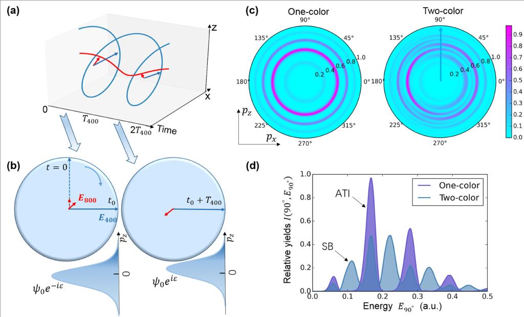 图1 (a)双指针同向旋双色光场 (b)电离时刻相差一个800nm光周期的两个隧穿电子波包 (c)强场近似理论计算的单色400nm光场和双指针光场下的光电子干涉图案 (d)图(c)中沿90度出射角的光电子能谱,即图(b)中的两个电子波包的干涉条纹