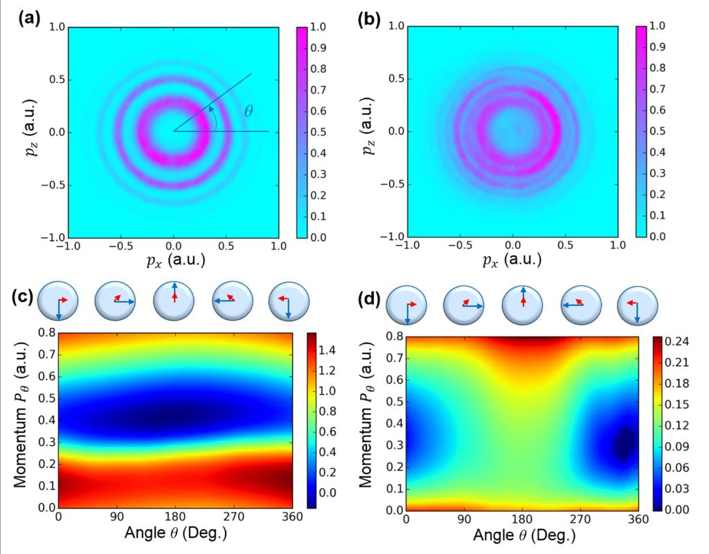 最近,北京大学“极端光学创新研究团队”的刘运全教授和龚旗煌院士等进一步发展了阿秒钟技术,采用同向旋转的双色(400nm + 800nm)圆偏振激光开展实验研究,实现了一种双指针阿秒钟测量技术。实验原理如图1(a)和1(b)所示,其中400nm圆偏振激光(激光电场相当于分针)是强的电离光脉冲,将电子从原子中电离,另外一束弱的800nm圆偏振激光(激光电场相当于时针)对电子波包进行测量。因为电离时刻相差一个400nm光周期的两个电子波包,将受到800nm光场的相反作用,这两个电子波包振幅和相位的变化将被映射到其干涉图案的变化中,比如[图1(c)是有无800nm光场时理论计算的光电子干涉图案]以及图1(d)是相应的电子能谱。这种干涉测量方法加上阿秒钟本身具备的时间分辨特性,使得整个测量装置可以类比于空间旋转的时域杨氏双缝实验。实验上,他们基于自行搭建的双色飞秒光场和高分辨的冷靶电子离子动量谱仪测量到了高分辨的光电子干涉图案[如图2(a)和2(b)]。进而,发展了一种基于傅里叶变换的提取电子波包振幅和相位的方法,通过电子干涉图案获得电离电子的波包信息,实验上提取的电子波包的相位和振幅如图2(c)和2(d)。该提取方案是普适的,不依赖于任何理论模型。该研究成果实现了在阿秒时间尺度上对隧穿电子波包的相干成像,将会促进强场物理中光电子干涉及全息成像研究。
