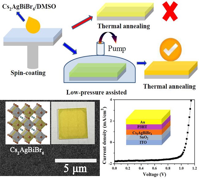 该研究组通过自己搭建的低压辅助设备首次制备出了高质量的双钙钛矿Cs2AgBiBr6薄膜,研究发现,该薄膜的热稳定性远远好于传统的铅基有机-无机杂化钙钛矿材料。将其用做吸光层,制备出了平面异质结太阳能电池。基于该薄膜的电池在空气中有很好的稳定性,对于无空穴传输层的器件在空气中放置超过4个月其效率没有衰减。说明双钙钛矿在太阳能电池的应用中有非常大的潜力。
