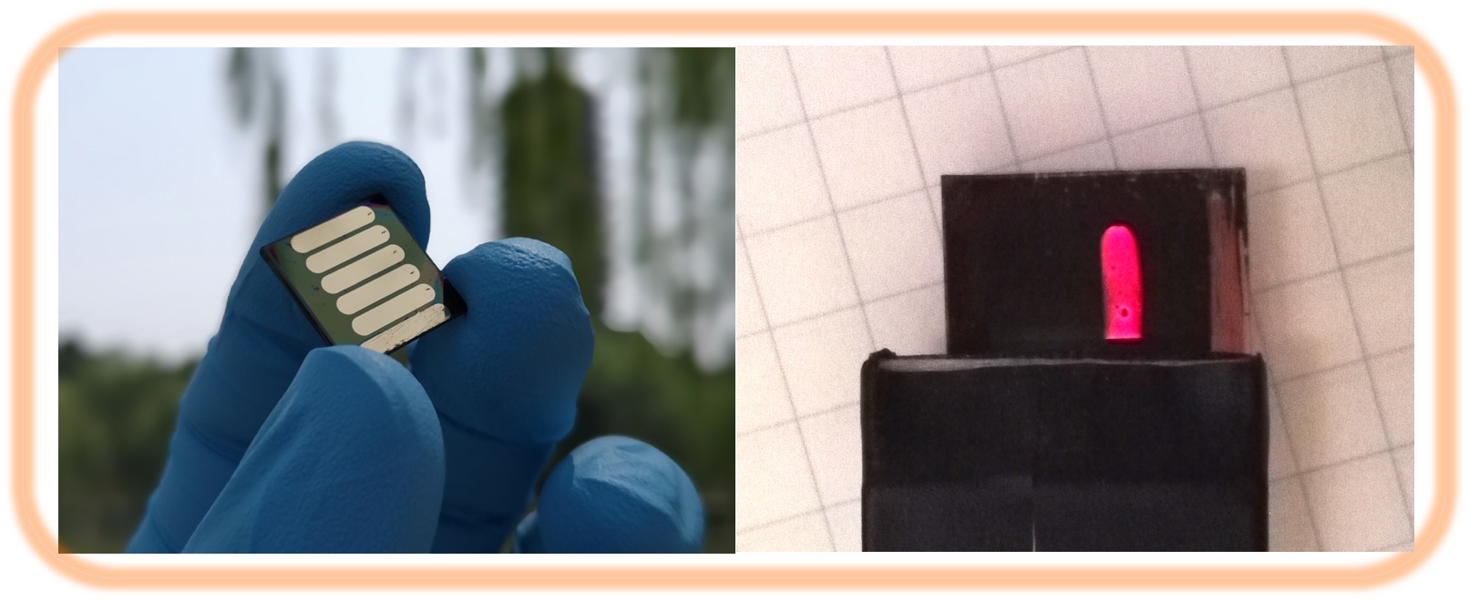 图1. 左:反式结构钙钛矿太阳能电池。右:电池器件在正向电压(2 V)下的发光照片(表明电池器件具有较低的非辐射复合能量损失)。