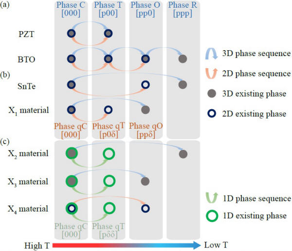 图1. 材料的相变序列(a) 满足标度律的传统铁电材料;(b) 不满足标度律的二维铁电材料;(c) 不满足标度律的一维铁电材料。当且仅当材料的低维相变序列发生改变时,标度律不成立,该材料有可能发现高Tc,即(b)(c),有待于进一步的实验发现。