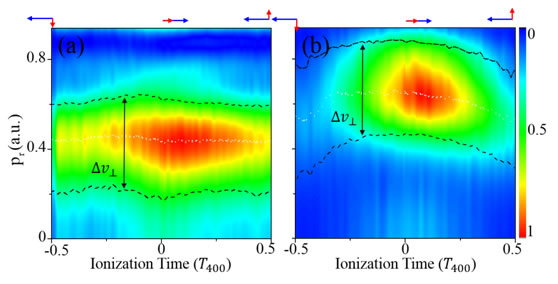实验提取的时间分辨的电子波包动量分布。800nm光场强度分别为(a)0.0045a.u.和(b)0.02a.u., 400nm电场强度固定为0.04a.u.。