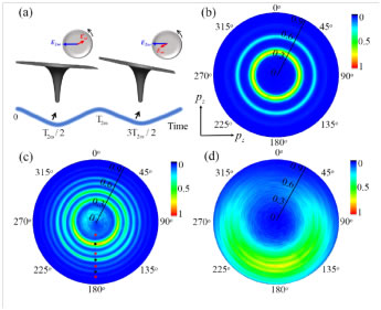北京大学人工微结构和介观物理国家重点实验室“极端光学创新研究团队”刘运全教授和龚旗煌院士等,针对双色同向旋圆偏光构建的阿秒钟的工作方式展开深入研究,并取得系列进展。他们首先利用双色(ω + 2ω)同向旋圆偏光可构建双指针阿秒钟[M. Han et al., Phys. Rev. let. 119,073201],其中弱的基频光ω做“时针”,强的二倍频2ω为阿秒钟的“分针”,打破了圆对称性,这种相互作用构型类似于空间旋转的时域双缝干涉仪(图1a),可从电子干涉谱上可提取阿秒时间尺度电子动力学信息。