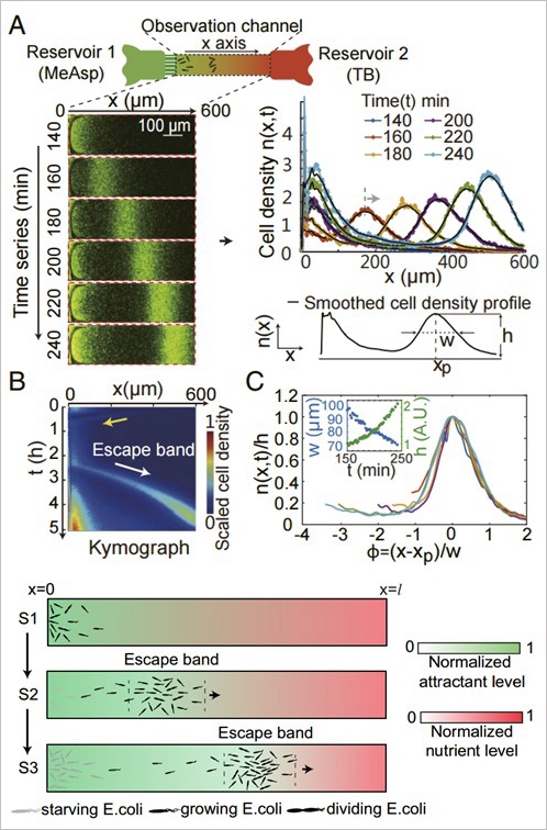 北京大学物理学院人工微结构和介观物理国家重点实验室/北京大学定量生物学中心欧阳颀院士领导的“生物物理”团队的罗春雄研究组在基于微流体细菌趋化分析芯片的实验研究中发现:在反向不同引诱物浓度梯度下,细菌首先趋向聚集于强引诱物而少营养的一端,但当细胞密度超过一个阈值时,细菌群落部分“逃逸”强引诱物浓度场,游向趋化因子相对弱但可代谢物质富集的一端。这一现象被刻画为细菌群体运动的“逃逸相变行为”。罗春雄研究组通过与美国IBM沃森研究中心的涂豫海教授(北大定量生物学中心资深访问学者)合作,对此现象涉及的趋化受体间的协作行为进行了系统细致的理论分析和实验论证,发现营养物质通过数量较少的Tap趋化受体进行了响应行为,而且在较大的一个趋化响应参数空间均会出现由细菌密度超过临界密度而产生的逃逸条带(“Escape Band”)行为,该行为可以使得细菌群落在复杂的趋化物浓度场中获得更好的生长优势。相关的定量实验与理论研究以“The escape band in Escherichia coli chemotaxis in opposing attractant and nutrient gradients”为题于2019年1月23日在线发表于Proceedings of the National Academy of Sciences of the United States of America(PNAS)杂志上。
