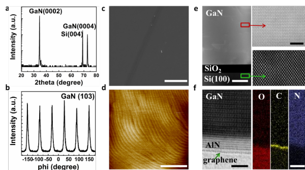 沈波和杨学林课题组创造性地使用单晶石墨烯作为缓冲层,在Si(100)衬底上实现了单晶GaN薄膜的外延生长,并系统研究了石墨烯上GaN外延的成核机理和外延机制。该突破不仅为GaN器件与Si器件的集成奠定了科学基础,而且对当前国际上关注的非晶衬底上氮化物半导体外延生长和GaN基柔性器件研制具有重要的指导价值。