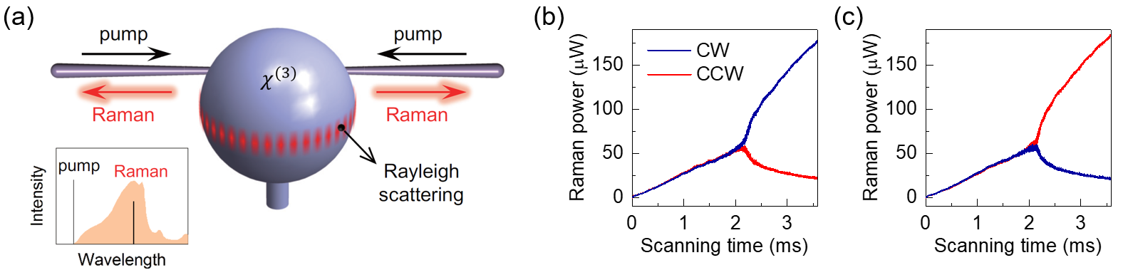 图1,(a) 自发对称破缺微腔拉曼激光系统示意图。插图:拉曼激光光谱,黄色阴影为增益范围。(b), (c) 拉曼激光发生对称破缺过程中顺时针(CW)和逆时针(CCW)的激光强度。