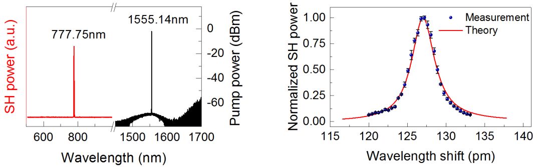 研究人员利用超高品质因子回音壁光学微腔极大增强光与物质相互作用的优势,在二氧化硅微球腔中获得了显著的二次谐波和二次和频信号。为了有效发挥微腔“双共振”增强效应,研究人员发展了一种动态相位匹配技术,利用光学微腔中热效应和光学克尔效应的相位调制,高效地实现了基波和谐波信号同时与微腔模式共振(如图2所示)。实验上获得的二次谐波转换效率高达0.049% /W,相比传统表面非线性光学的结果增强了14个数量级。