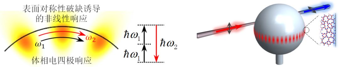 图1 左图:表面二次谐波效应示意图;右图:光学微腔增强表面非线性效应。