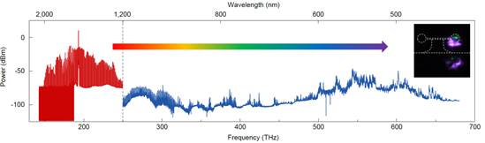 图2: 实验实现的覆盖450-2000 nm、跨越两个倍频程展宽的微腔光梳光谱图。插图:显微镜直接观测到的多色可见光出射