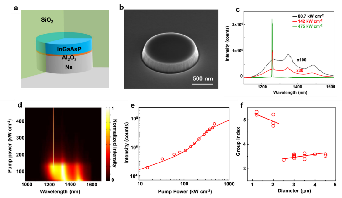 研究团队在此基础上进一步开发了钠基等离激元功能器件。纳米激光光源是光子芯片集成的核心器件之一,更小体积、更高调制速度、更低功耗且能在室温下工作的激光器一直是其发展的目标。例如,在电子芯片上实现光互连就要求激光器的特征尺度接近电子器件,功耗也要小于电互联。然而,常规激光的小型化受到光学衍射极限的制约,特征尺寸只能小至光波长量级。引入金属微纳结构,通过表面等离激元的辅助,光源不但能够突破光学衍射极限,缩小特征尺寸,而且能够增强光与物质相互作用,有效降低激光器的激射阈值和器件功耗。团队解决了钠旋涂工艺与微纳加工的兼容性问题,研制出了钠基通讯波段等离激元纳米激光器。室温下该激光器的光泵激射阈值仅为140千瓦每平方厘米,创造了同类等离激元纳米激光器室温激射的阈值新低(图2)。值得一提的是,得益于有效的封装保护,该激光器件在正常环境下6个月后仍然保持了良好的工作性能。同时,研究团队在高温和高湿环境下进行了钠基器件的加速老化实验,证明了制备的钠基等离激元器件具有非常好的耐受能力。