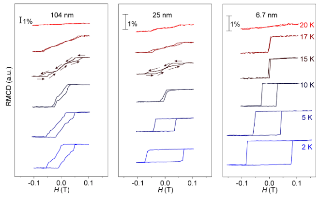 对此,杨金波课题组与叶堉课题组合作发现了一种新型的四元二维铁磁半导体AgVP2Se6,为稀少的二维铁磁家族增添了新的成员。AgVP2Se6的居里温度为18 K,磁畴沿着面外c轴方向。通过机械剥离得到了最薄4层(2.9 nm)的样品,并研究了少层材料的磁性。对于较厚的样品,磁滞回线表现为台阶状。随着厚度的降低,磁滞回线逐渐变方。测量的最薄样品(6.7 nm)在居里温度以下各温度磁滞回线完全演变为方形,成为了一个硬磁材料。这一成果近期发表在了Advanced Functional Materials上,文章题为“A quaternary van der Waals ferromagnetic semiconductorAgVP2Se6” (DOI: 10.1002/adfm.201910036)。北京大学博士生彭宇轩为第一作者,通讯作者为北京大学叶堉研究员与杨文云工程师。