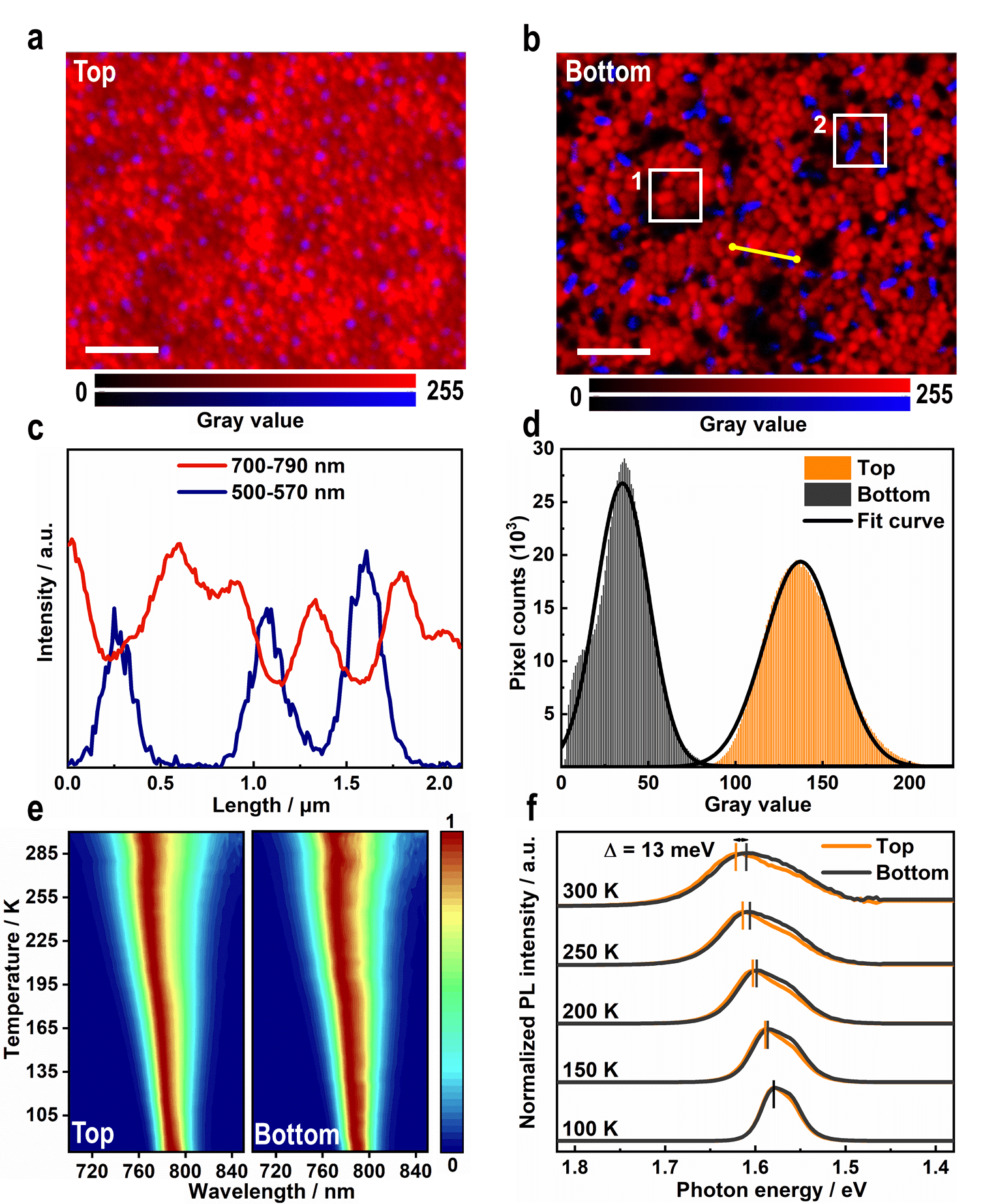 图4. 钙钛矿多晶薄膜顶面与底面的变温荧光及多通道荧光成像
