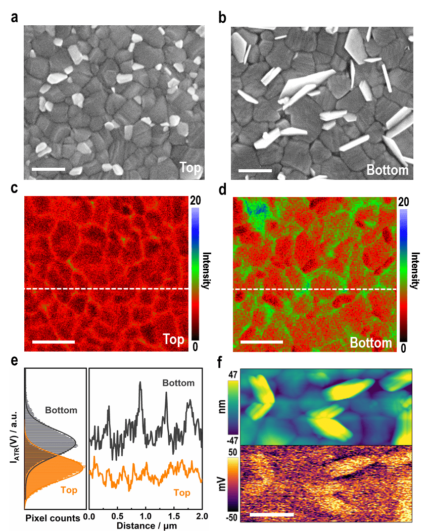 研究团队对暴露的薄膜底面进行了一系列形貌、化学成分以及表面电势表征,如图3所示,结果表明:相较于薄膜顶面,底面存在更严重的半导体异质性。这可能源自于钙钛矿多晶薄膜溶液生长结晶过程而导致顶面与底面的差异。