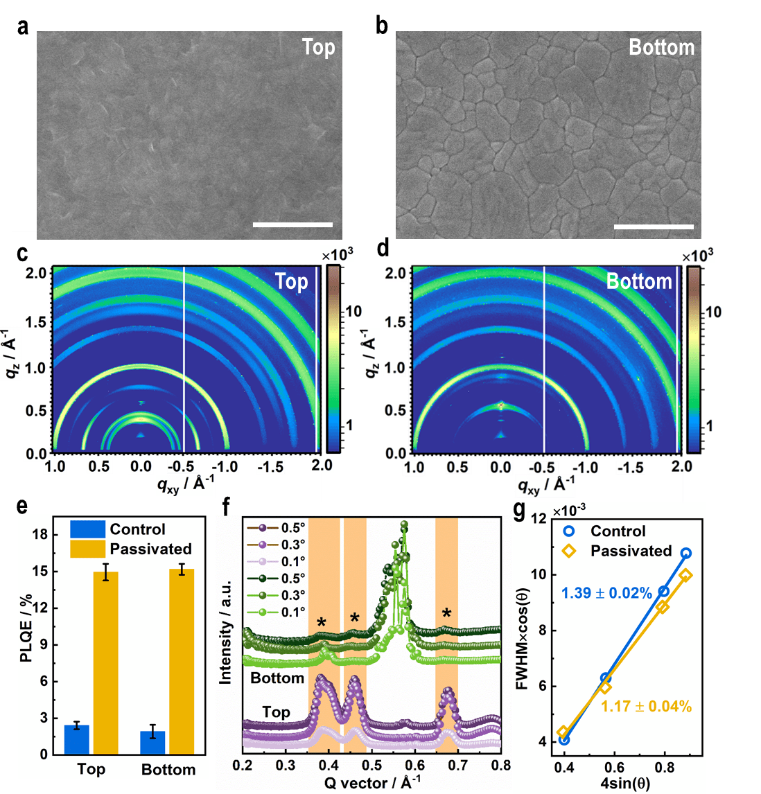 图5. 卤化铵表面钝化后钙钛矿薄膜顶部和底部性质