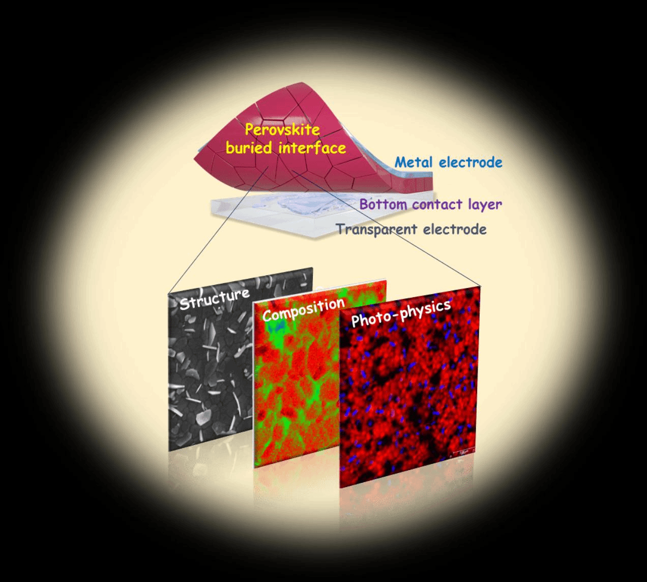 受益于有机无机杂化钙钛矿光电材料优异的半导体特性,钙钛矿太阳能电池的光电转换效率在近十年迅速发展,吸引了光伏能源领域广泛的关注。钙钛矿多晶薄膜的上下两个界面通常被认为是缺陷富集的区域,是限制钙钛矿光伏器件效率提升的主要因素。目前,大多数研究工作都集中在对薄膜上表/界面的认知与优化,而对于被隐埋的、非暴露的底界面(buried interface,简称“埋底界面”),则缺乏系统的认知和深入的理解。同时,对于溶液生长的多晶钙钛矿化合物半导体薄膜,大多数研究都是通过对薄膜上表/界面的表征结果来间接推断底界面性质,缺乏严谨的科学性。因此,相对于成熟的上表/界面研究,钙钛矿薄膜的“埋底界面”对广大研究者来说仍然是一个被深埋的、没有被打开的“黑匣子”。