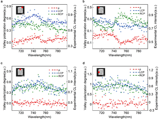 最为引人注目的,是这种方法可以在室温下就实现对单层TMDs材料能谷的近场选择性激发,这种激发方式能够克服传统的光学激发衍射极限。电子束激发位置的移动带来对应的谷极化动态操控(图2),在50纳米左右的调控步长即可实现谷极化度从约15%到-10%的变化。这种深亚波长尺度的谷极化操控,可应用于介观及量子谷电子学研究中。