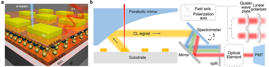 图1:(a)结构示意图。(b)阴极荧光探测系统示意图