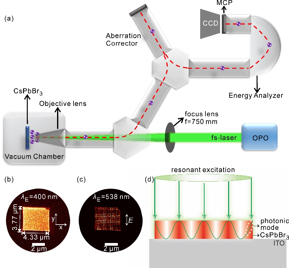 研究团队基于飞秒-纳米时空分辨光学实验系统研究了钙钛矿表面缺陷态的微观动力学特性(Nano Letters, 21(7), 2021);近期利用PEEM进一步开展了无机钙钛矿CsPbBr3微腔的空间特性研究(图1(a))。光电子成像系统具有高达10nm的空间分辨率,可以表征钙钛矿微腔表面的光电子分布。研究发现,光电子成像结果与激发光波长(λE)相关:当λE=400 nm时,钙钛矿微腔表面的光电子分布均匀,反映了样品表面形貌特性(图1(b));在亚禁带共振光激发(λE=538 nm)条件下,钙钛矿微腔表面呈现清晰的干涉模式(图1(c))。图1(d)给出了钙钛矿微腔表面的干涉模式形成机理,即微腔内传播的光子学模式与入射光场的干涉结果。