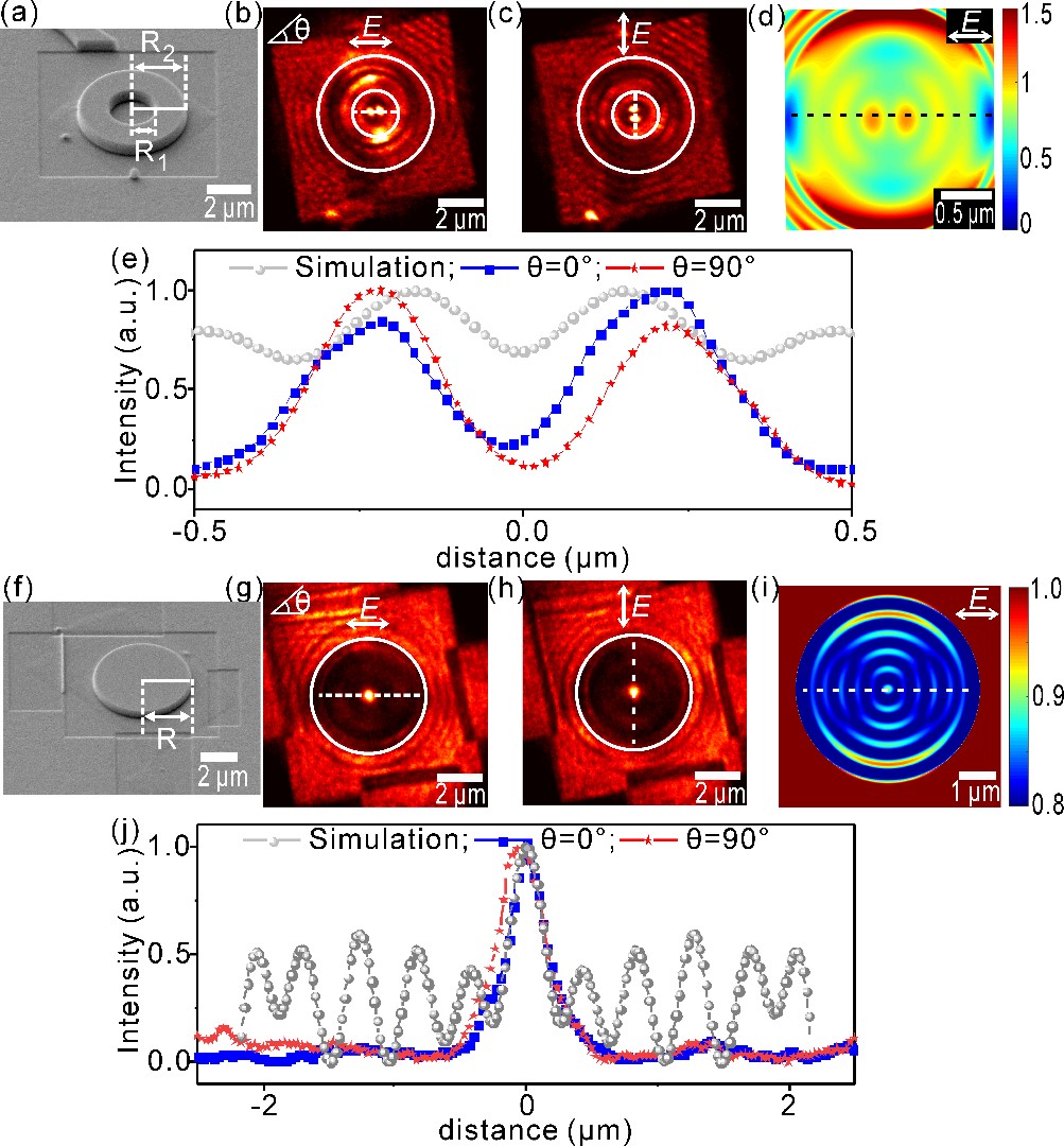 图3 钙钛矿微腔光学模式控制研究:(a)微环钙钛矿扫描电子显微(SEM)成像图;(b-c)腔内模式实验中亚禁带激发下微环钙钛矿光电子成像结果;(d)时域有限差分(FDTD)法数值分析结果;(e)腔内模式实验与理论数值分析对比;(f-j)对微盘钙钛矿微腔的研究结果