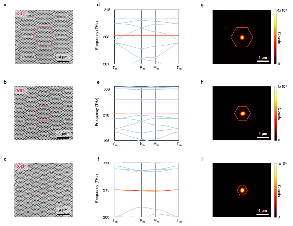 图3 不同转角(4.41º、6.01º和9.43º)下,魔角激光器的电子显微镜照片(a-c)、能带结构(d-f)和激射近场光斑照片(g-i)