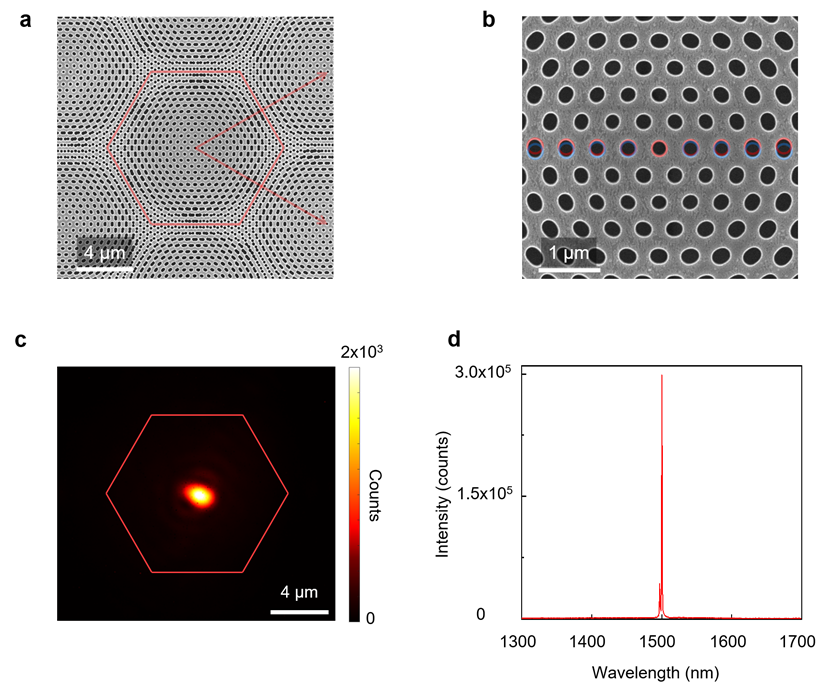 不同于两层石墨烯扭转形成电子体系的魔角结构,课题组利用微纳加工技术,将两套扭转的光子晶体晶格做在同一层的半导体材料中(图2a, b),由此形成具有更大周期的莫尔超晶格,其对应的布里渊区内会因两套光子晶体模式之间的耦合而形成光子晶体能带的扁平化,对应的实空间波函数分布也会局域化。由于两套光子晶体中的布洛赫波函数在垂直于传播方向的维度完全重合,两者之间的耦合也随之增强,所以在较大的扭转角度下仍然可以得到光场的强局域化。课题组对两套光子晶体之间扭转角度为2.65º的魔角纳米光腔开展了详尽的理论和实验研究;三维模拟计算表明,该纳腔的模式体积仅约0.02×(波长)3,品质因子高于4×105。该魔角纳腔在功率约为6 kW/cm2激励下发生自发辐射到受激辐射的阈值转变,激射后辐射光谱线宽约0.24 nm(图2c, d)。