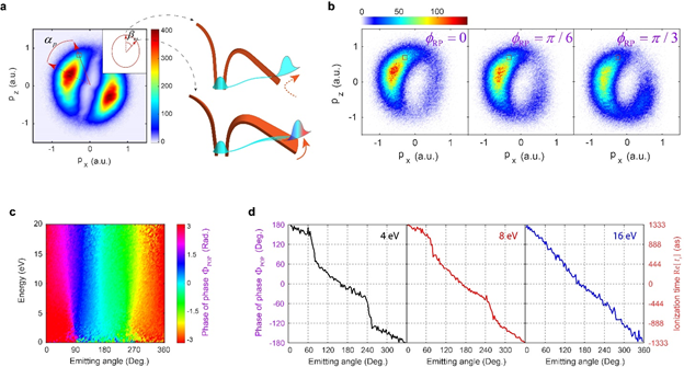 (c)实验提取的“相位之相位”谱; (d) 不同电子能量处的时间-角度映射曲线