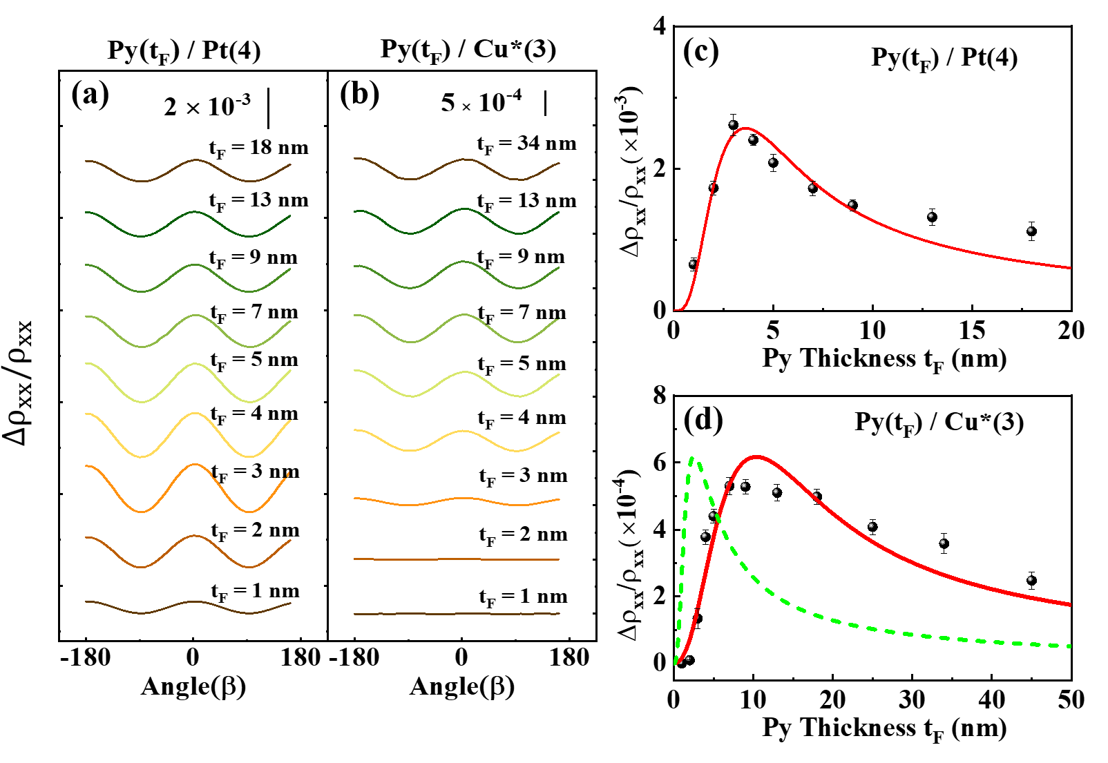 图2 (a)-(b) 6 T 磁场下,Pt(4 nm)/Py(tF )和 CuOx(3 nm)/Py(tF) 在 β 平面内的磁电阻效应;(c)-(d) 两个体系中磁电阻比率随 Py 厚度的变化关系(其中,红色曲线是数据的拟合曲线,绿色虚线曲线表示将 Py 的自旋散射长度带入公式后获得的磁电阻与 Py 厚度的变化关系,表明体系中的磁电阻效应不来自于自旋流)