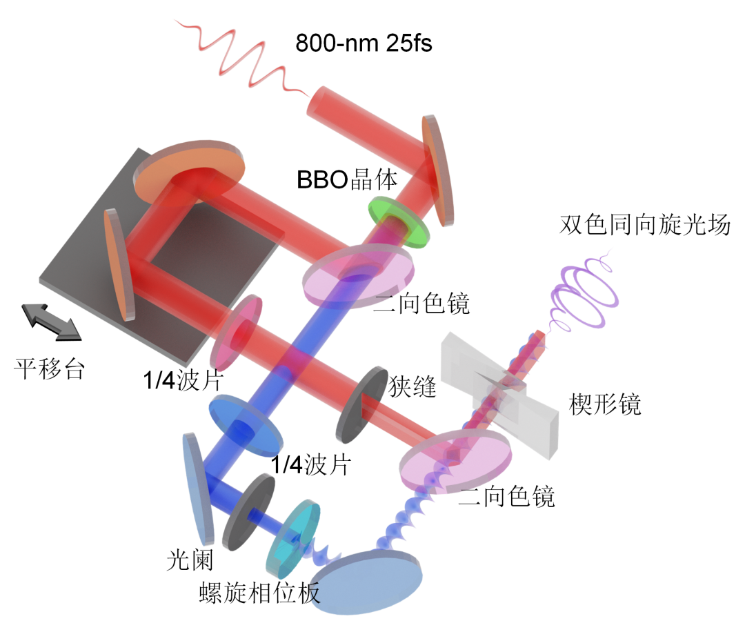 研究者们采用了双色激光场整形技术,将基频光(800-nm)通过BBO晶体倍频(400-nm),然后借助马赫-曾德尔干涉仪(图1),产生以及调控双色同向旋光场(图2)。