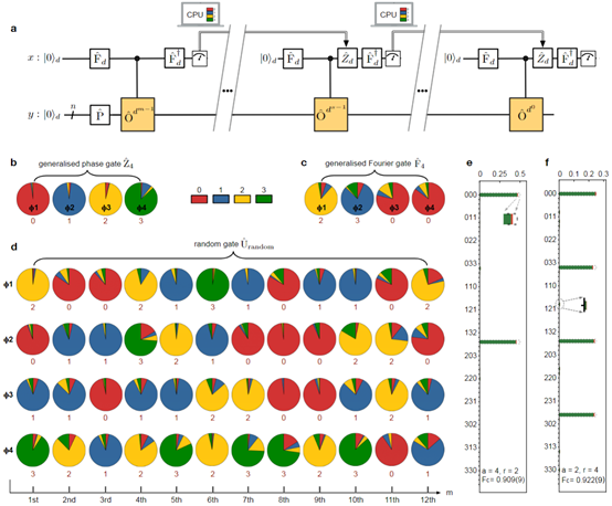 图3 高维量子相位估计算法和量子快速大数分解(求阶)算法的实验结果。(a) Kitaev迭代量子相位估算算法和迭代求阶算法的高维量子线路图;(b-d) 广义相位门、傅里叶门和随机门的量子相位估计计算结果,红色数字下标为理论结果;(e-f) 高维量子求阶算法的输出概率分布实验结果,分别对应a=4和a=2的情况。