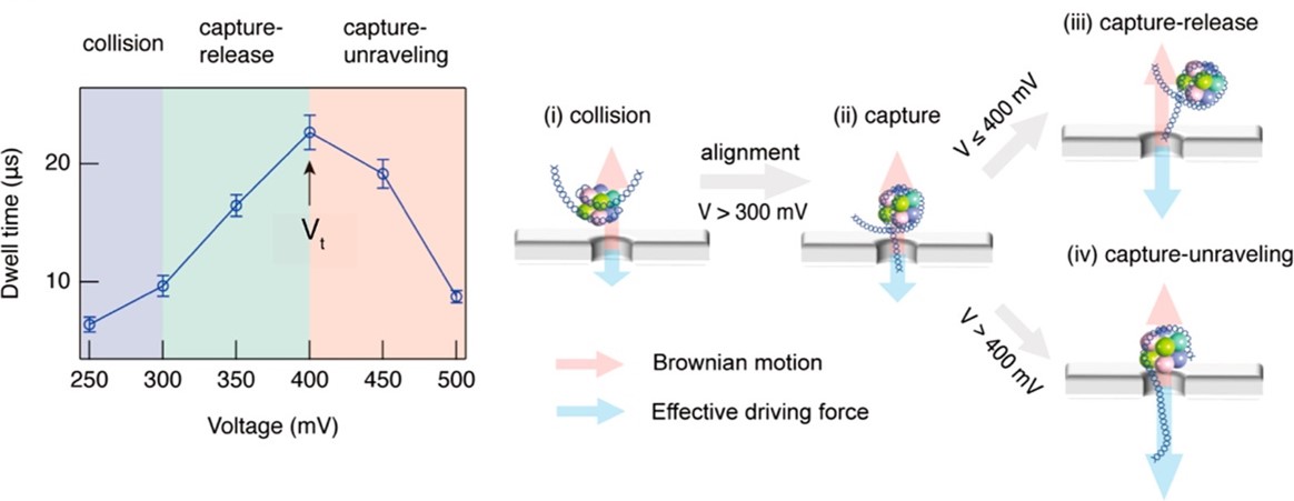 近日,人工微结构和介观物理国家重点实验室(北京大学)赵清教授课题组与中国科学院生物物理研究所李国红研究员课题组合作,利用固态纳米孔力学表征技术实现了对单个核小体分子的操控,进而研究了两种组蛋白后修饰对核小体结构的影响。联合研究团队首先利用实验表明纳米孔内DNA所受到的力以及核小体和组蛋白之间的相互作用力是决定核小体穿孔信号类型的两个重要因素(图1),并通过改变施加电场的大小,发现了DNA从组蛋白上解离的临界电压(图2);在此基础上,探测了两种泛素化修饰的组蛋白对核小体稳定性的影响,发现H2A组蛋白上的泛素化增强了DNA和组蛋白之间的相互作用,而H2B组蛋白上的泛素化减弱了DNA和组蛋白之间的相互作用,从而使核小体结构不稳定,有利于后续基因表达。该技术有望发展成为低成本、快速的核小体泛素化探测手段,对基于泛素化的基因调控研究具有重要意义。