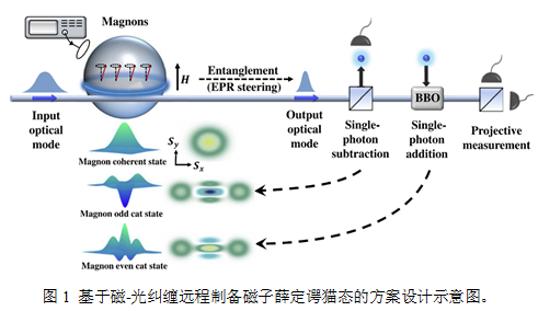 薛定谔猫态的制备与调控是量子物理与量子信息领域的关键科学问题之一,为量子计算和量子精密测量提供了重要资源。面向构建长距离量子网络与发展大规模量子计算的需求,如何实现猫态的远程制备与调控成为亟待解决的科学问题。磁子系统由宏观数量的自旋构成,相干时间长,且具有频率高度可调谐性可与微波、光波、超导量子比特等多种体系产生耦合,是研究猫态等宏观量子态性质、发展基于猫态的量子信息技术的理想平台。