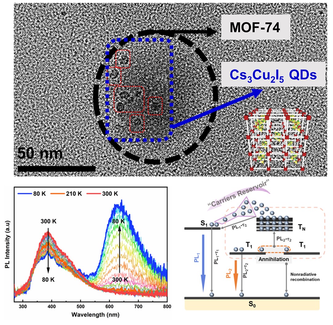 鉴于此,基于前期对无铅钙钛矿量子点的研究基础,人工微结构和介观物理国家重点实验室曲波课题组首次采用MOF限域法,在室温条件下原位制备出高湿度稳定性的无铅类钙钛矿Cs3Cu2I5深蓝光量子点,平均粒径仅为4.3 nm。从TEM 图像(图1)中可以明显看到Cs3Cu2I5 量子点被“镶嵌”在MOF框架内。Cs3Cu2I5量子点荧光发射峰位于390 nm,相应色度坐标为(0.17, 0.07),接近国际上定义的标准蓝光色度坐标(0.14, 0.08)。凭借MOF材料有效的支撑保护作用,量子点的湿度稳定性非常优异,在相对湿度70%的环境中储存1440 小时后,Cs3Cu2I5量子点仍能保持初始发光效率的87%。变温光致发光测试(图1)表明,Cs3Cu2I5量子点具有明显的温度依赖性,即随着温度降低,原有深蓝色荧光发射逐渐减弱,同时出现一个峰位650 nm 的橙色发射峰,该物理过程类似于有机发光中的三线态-三线态-湮灭上转换过程。课题组根据Cs3Cu2I5量子点荧光发射与寿命衰减特征,构建出了Cs3Cu2I5@MOF中的载流子输运模型(图1),并合理解释其物理机制。
