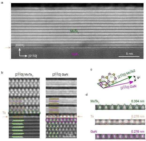图2 在GaN基底上异质外延的2H-MoTe2界面扫面透射电镜表征