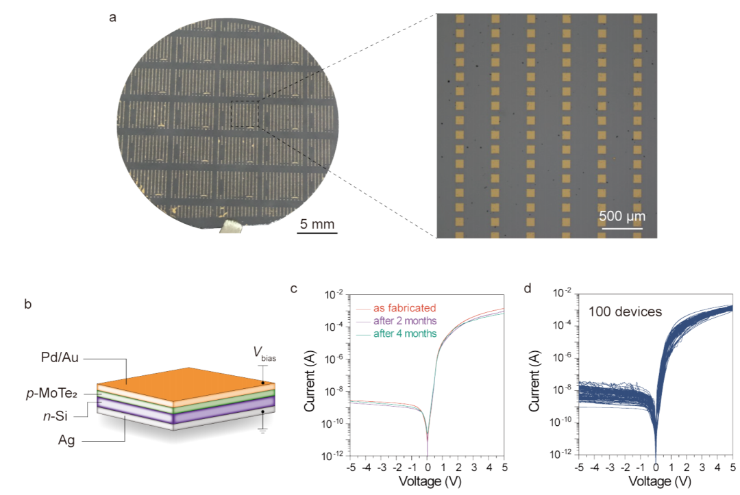 图4 晶圆级别的2H-MoTe2/Si异质pn结器件与伏安特性表征