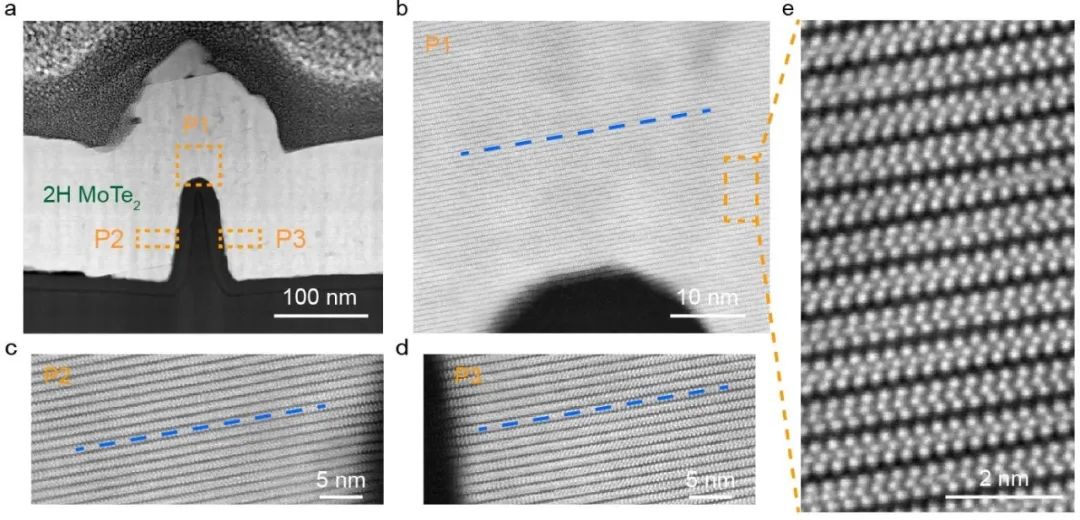 图3 在鳍形硅基底上异质外延的2H-MoTe2薄膜的截面扫描透射电镜表征
