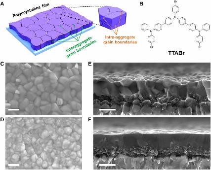 固态多晶薄膜示意图和钙钛矿薄膜形貌:A.多晶薄膜,包含聚集体间晶界(绿色箭头)和聚集体内晶界(橙色箭头);B. TTABr的化学结构;C,D.钙钛矿薄膜的表面SEM图片,对照组(C),实验组(D);E,F.钙钛矿薄膜的截面SEM图片,对照组(E),实验组(F)