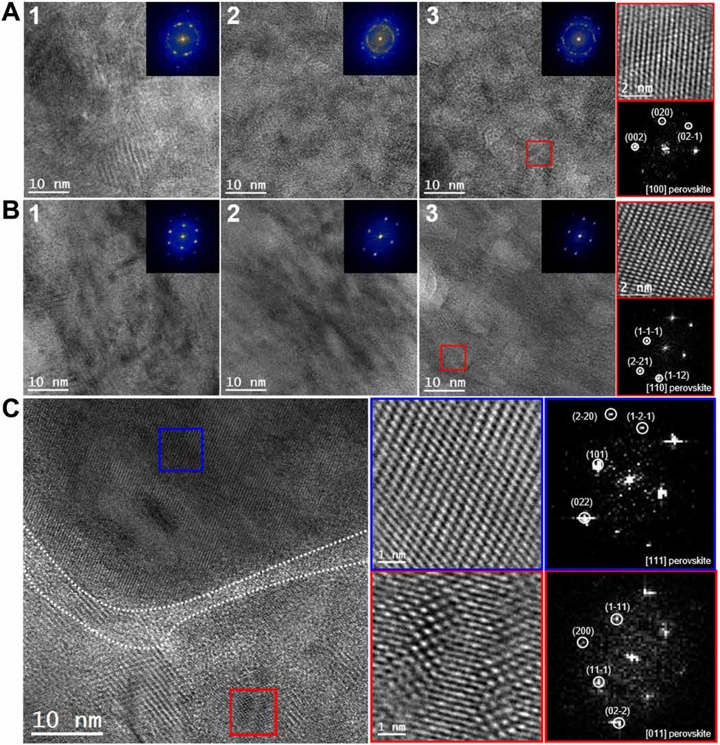 钙钛矿晶粒、晶粒聚集体和聚集体内晶界的直接观测:A.对照组;B.实验组;C.包含聚集体内晶界的代表性区域HRTEM图片