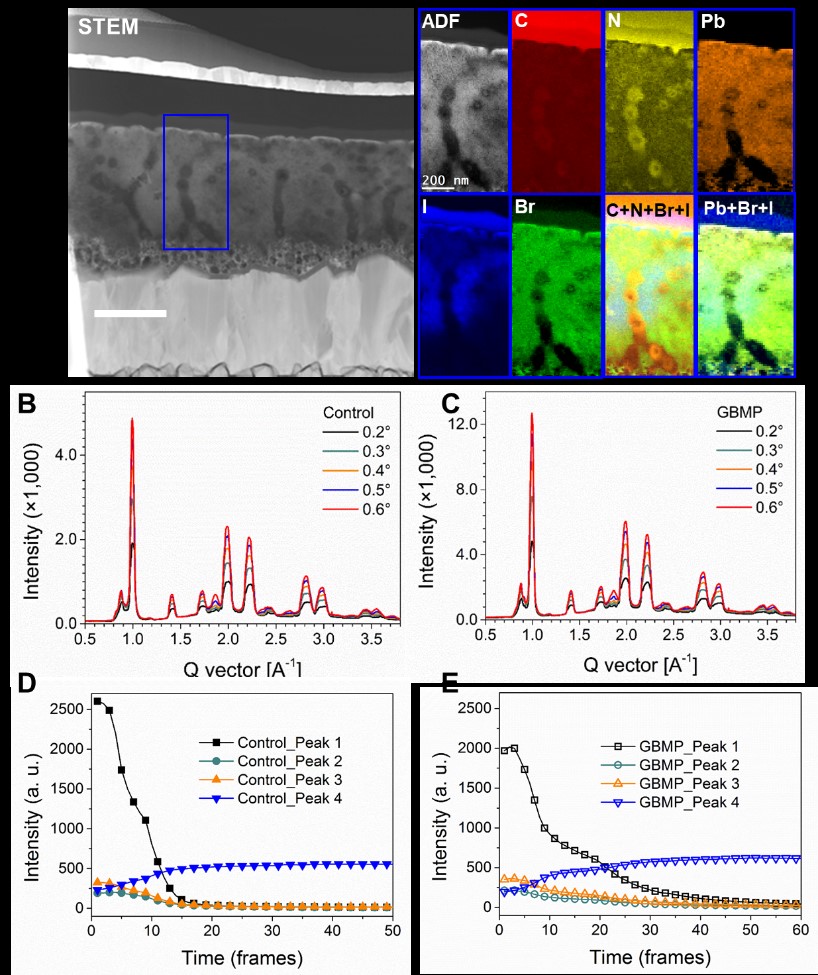 钙钛矿薄膜的STEM-EELS化学成分图谱和GIXD结果:A.实验组器件截面的STEM图片及元素分布;B,C.不同入射角下的积分GIXD,对照组(B),实验组(C);D,E.薄膜退火过程中特征峰强度随时间的变化,对照组(D),实验组(E)