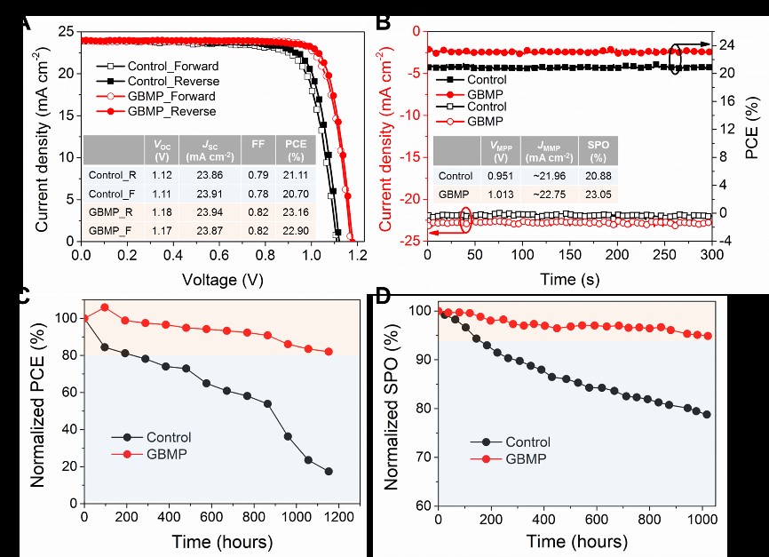 器件光伏性能提升:A.对照组和实验组最优器件的J-V曲线;B.最优器件的最大功率点稳态输出对比;C.器件的热稳定性对比;D.器件在一个太阳下最大功率点稳态输出稳定性对比