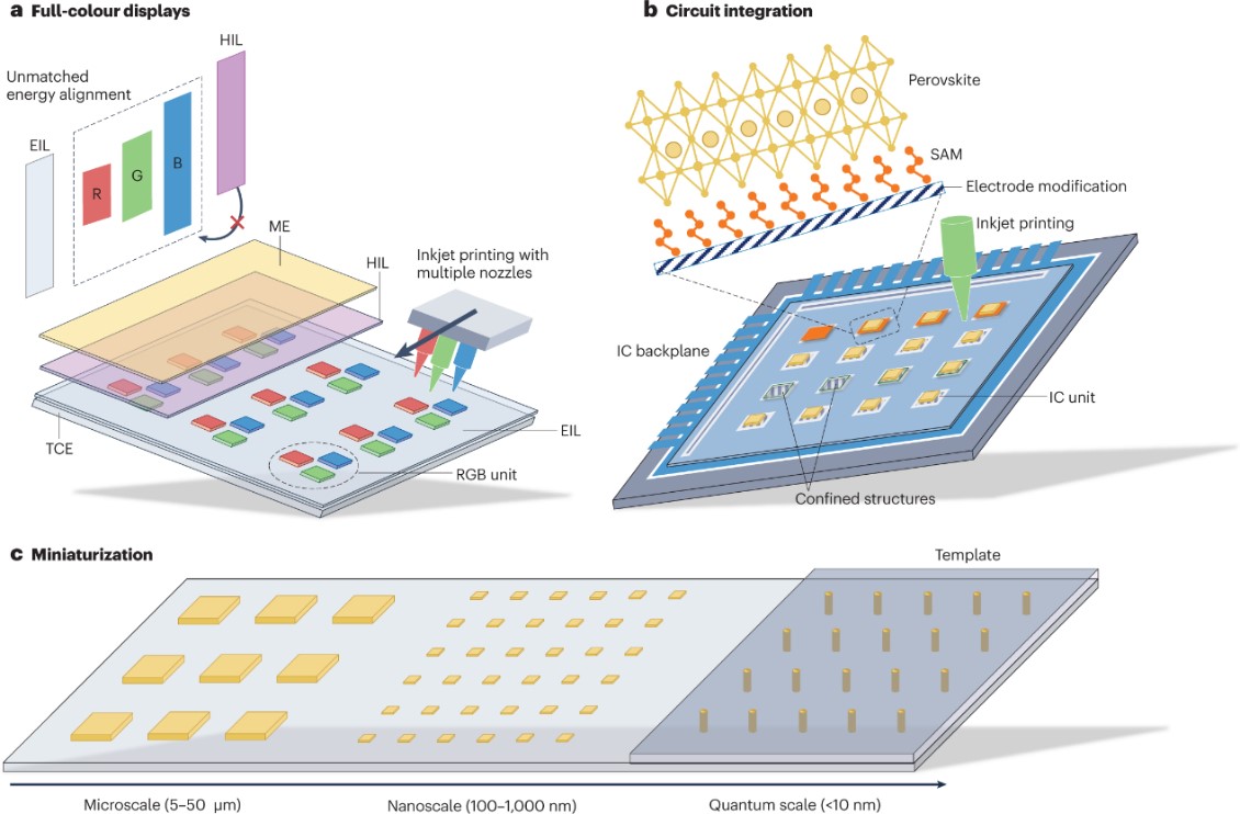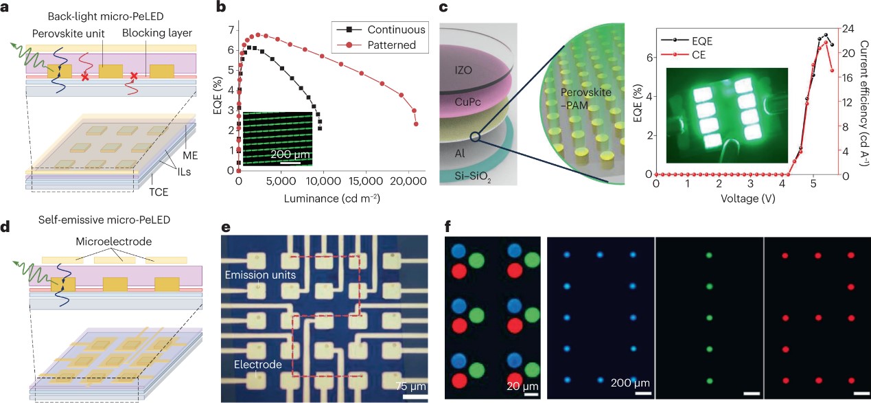 PeLED(钙钛矿发光二极管)是当下光电领域的研究热门。相较于传统LED(发光二极管)中的GaN基发光材料,钙钛矿材料拥有可溶液加工、成本低廉、发光波长易调等优势,基于钙钛矿发光层的PeLED效率记录已接近29%,极具发展潜力。把PeLED微型化将有可能规避传统micro-LED中常见的纳米刻蚀损伤、巨量转移等工艺难题;同时,相较于PeLED中常见的钙钛矿薄膜发光层,纳米级独立微晶是目前最高效率红、绿、蓝、及近红外PeLED的主要发光层结构形式。已有报道也证实,不断缩小发光单元将是PeLED效率突破的关键发展趋势。因此,micro-PeLED有望成为实现超清显示应用的理想技术路线之一。