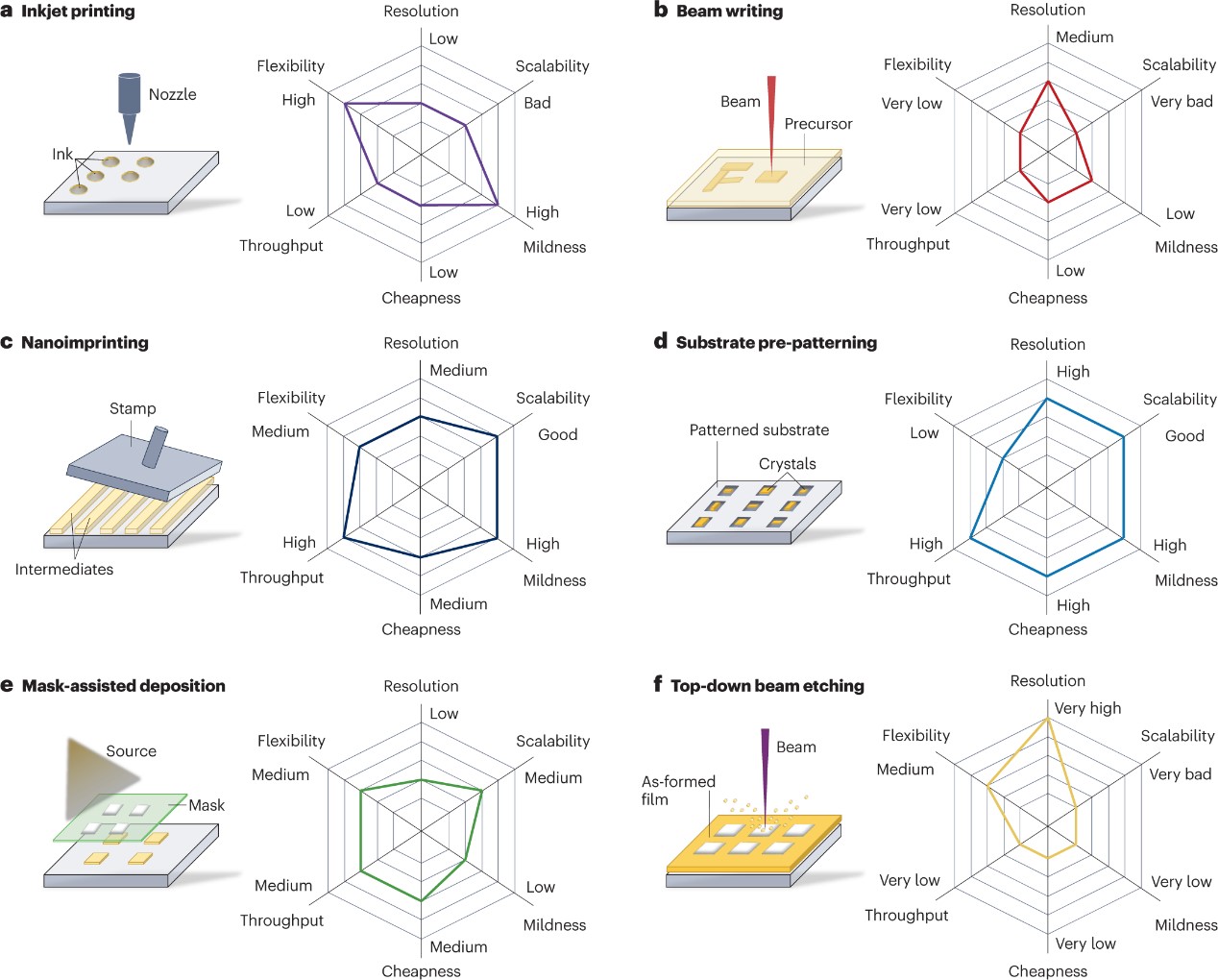 随后,文章综述讨论了当前六大类钙钛矿图案化技术(喷墨打印、光直写、纳米压印、基底预图案、模板辅助、激光刻蚀)的最新研究进展,分析对比了各图案化技术在分辨率、可扩展性、加工损伤、成本、加工效率、技术柔性六个维度的能力分布,从中筛选纳米压印与基底预图案为最具潜力的钙钛矿微型化技术方案,并评论了各图案化技术未来的发展方向(图2)。